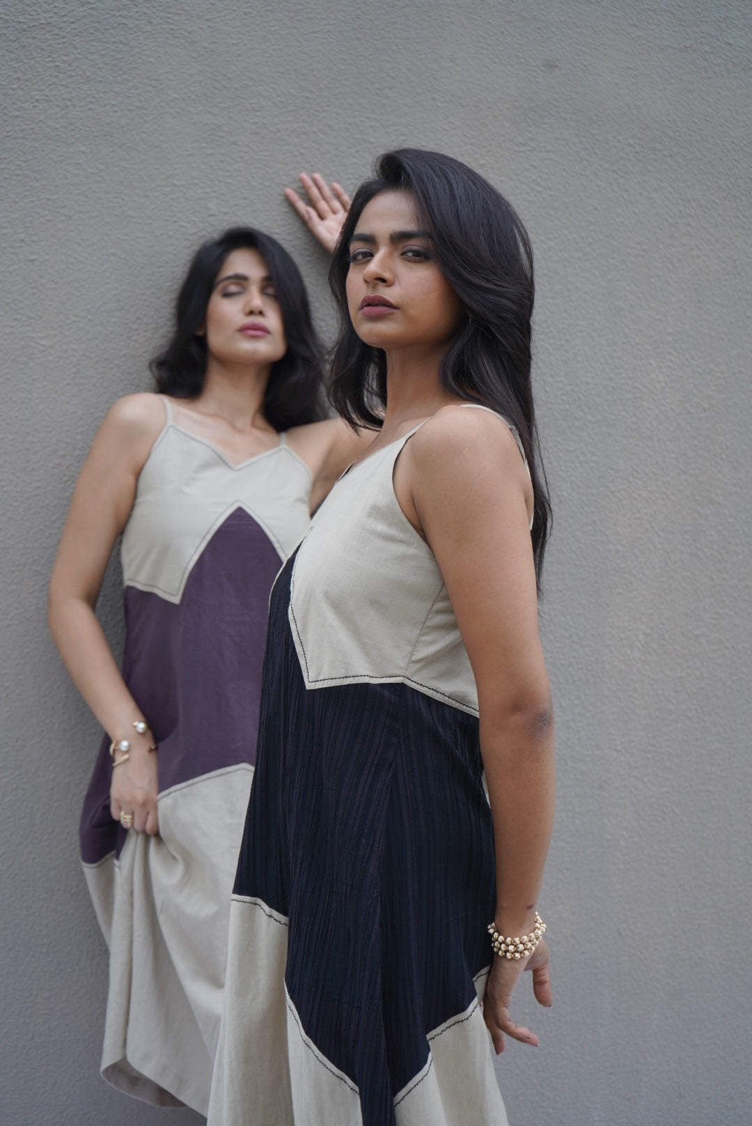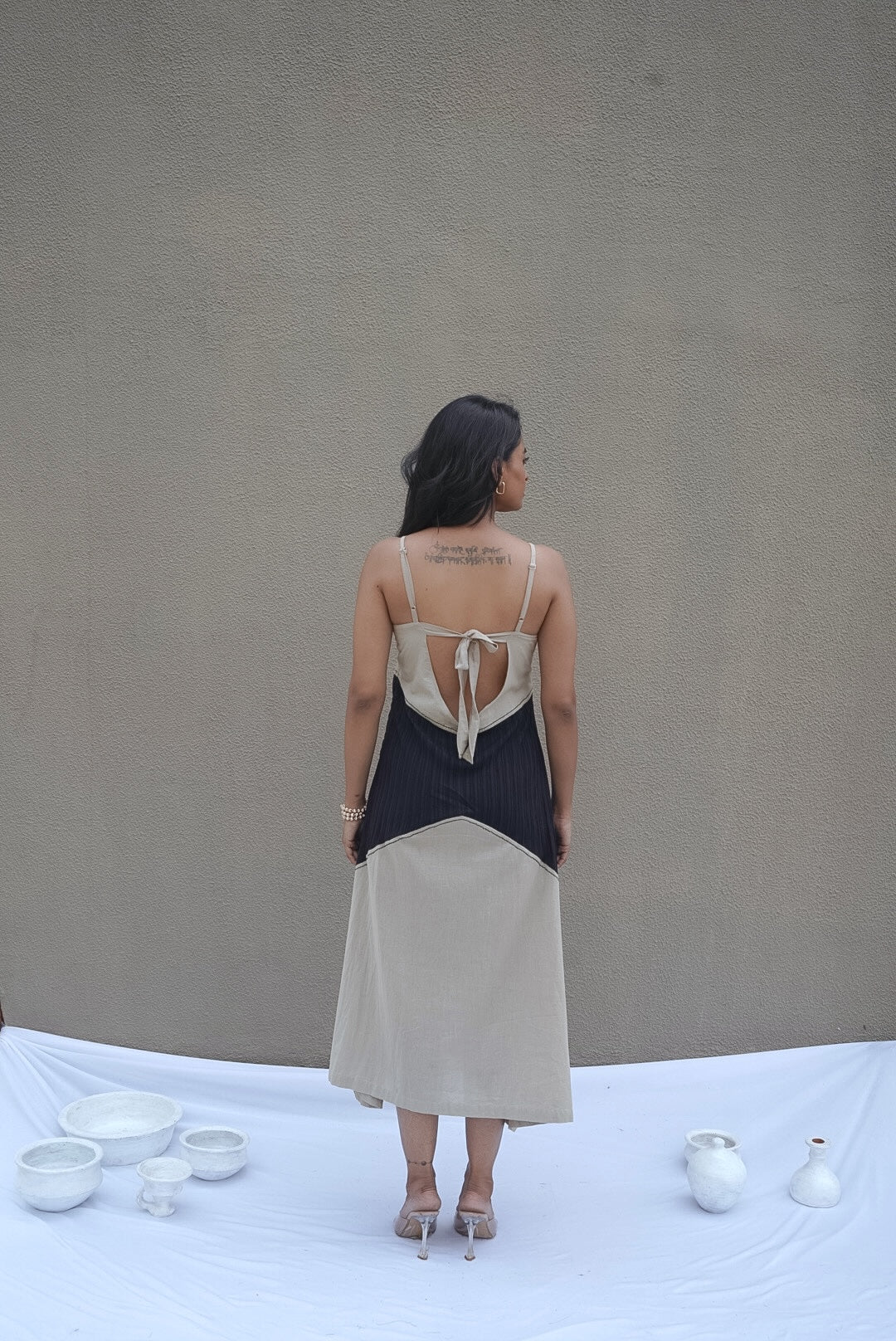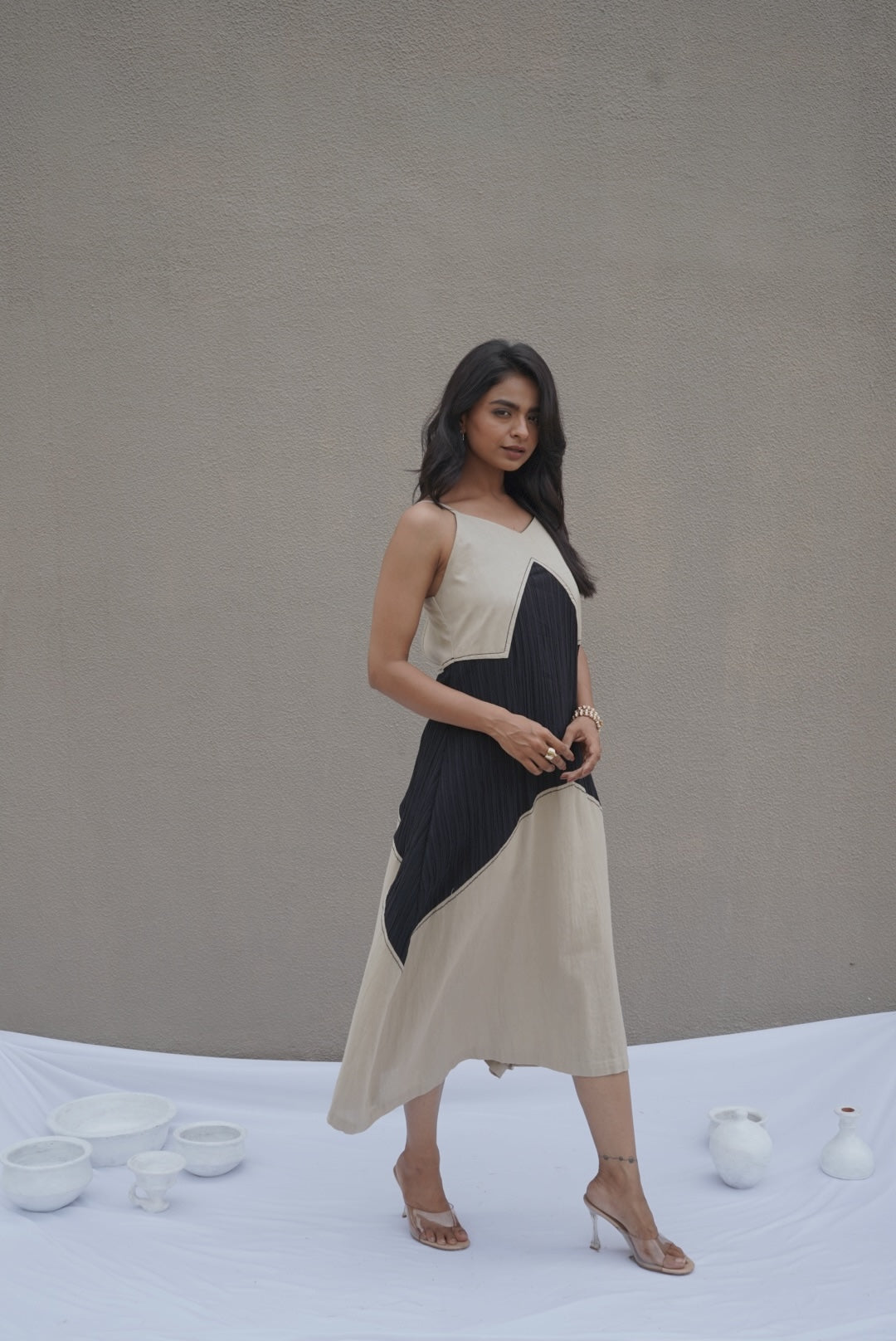 The Beige Noir Panel Dress combines sophistication and modern edge with uniquely shaped panels, blending contrasting colours and textures for a standout, stylish look.