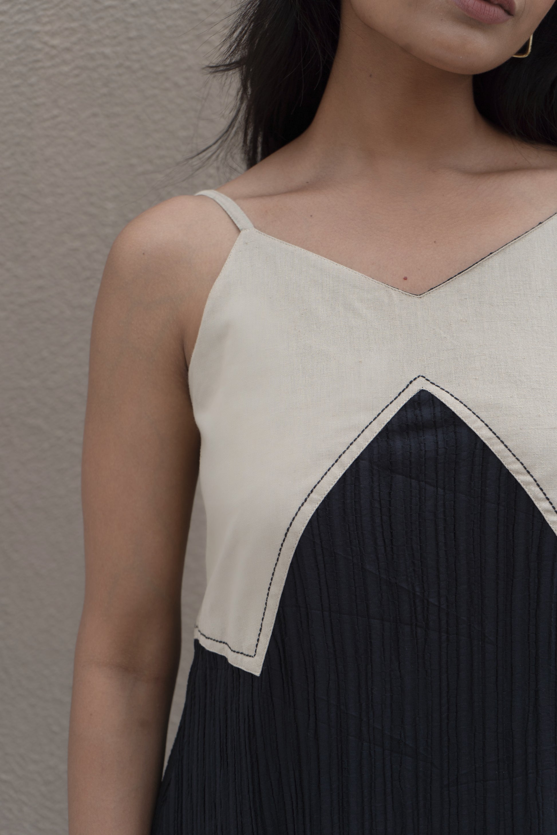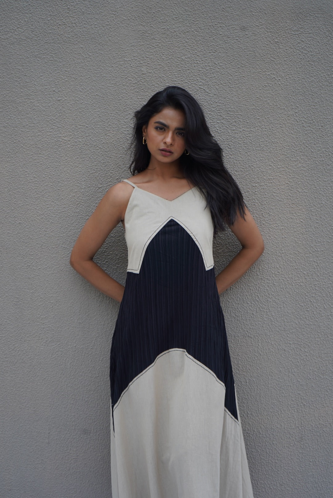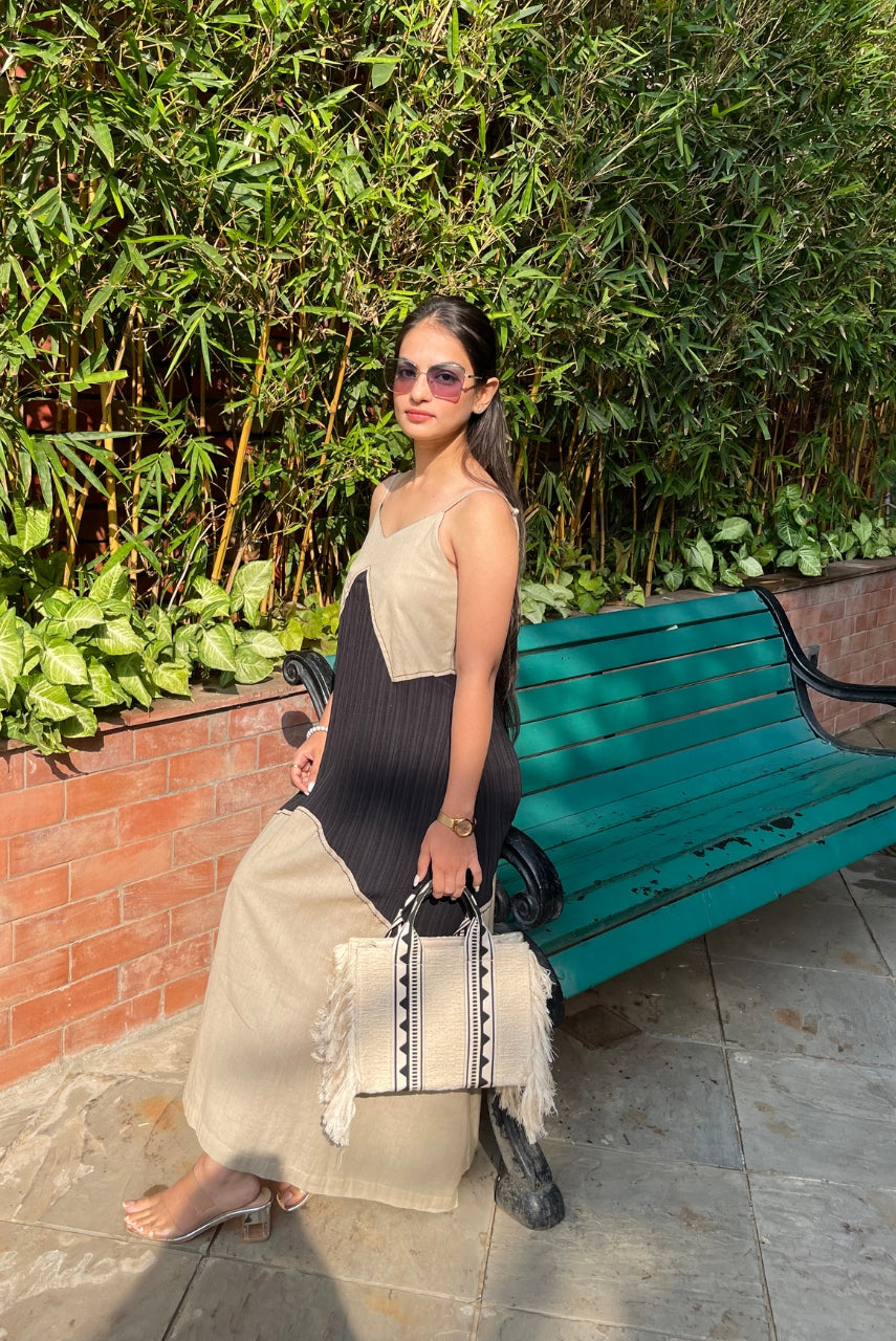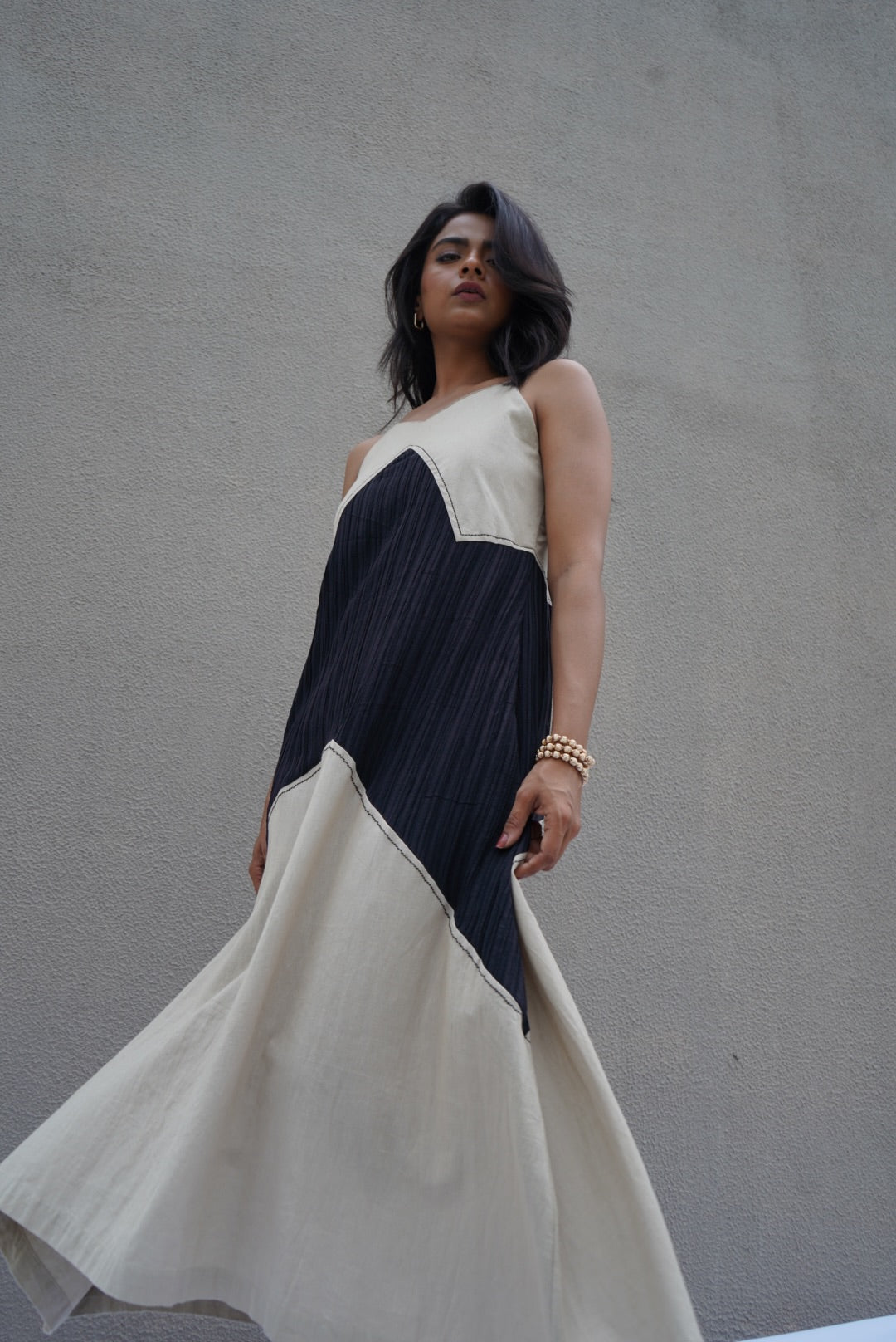 The Beige Noir Panel Dress combines sophistication and modern edge with uniquely shaped panels, blending contrasting colours and textures for a standout, stylish look.