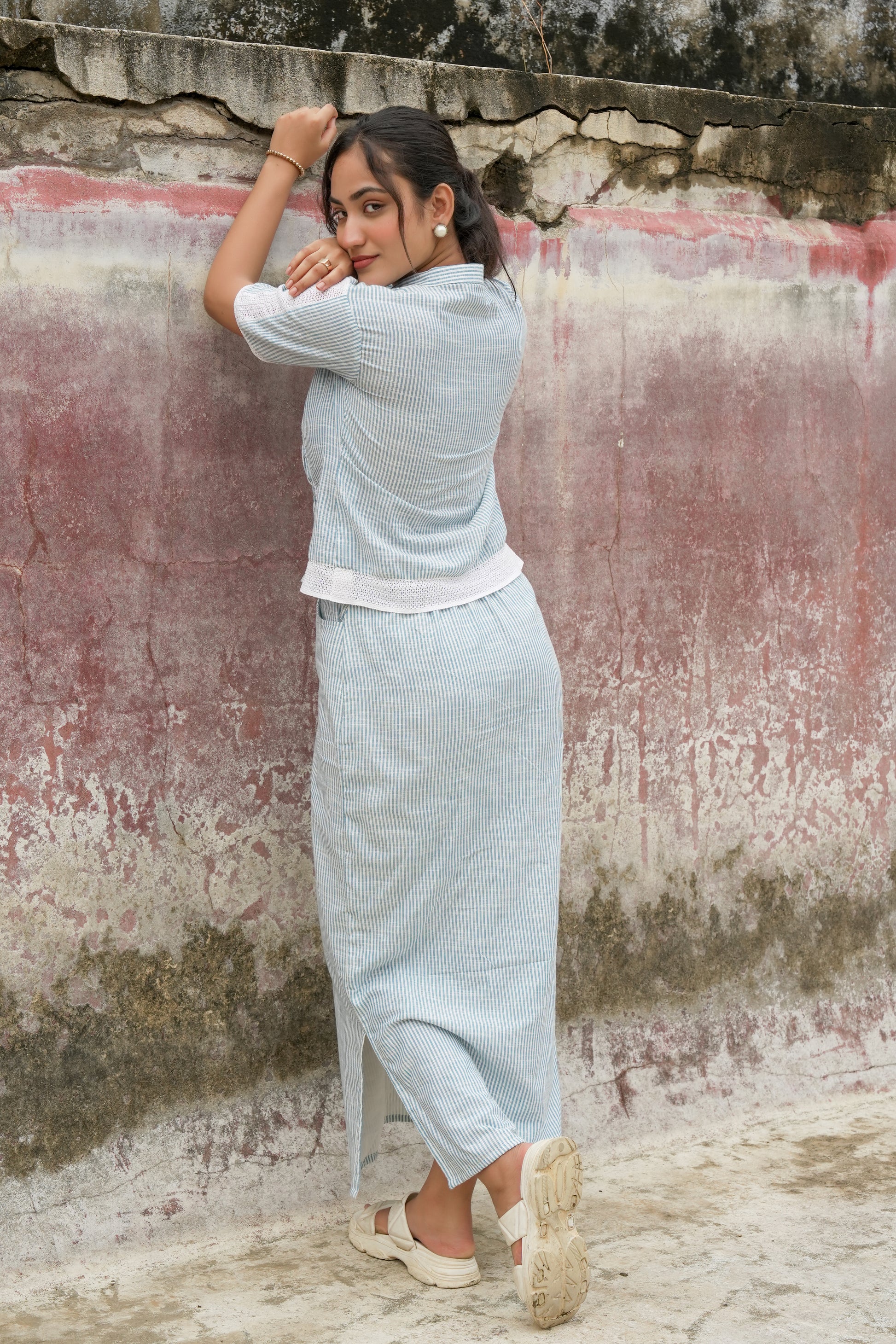 A breezy blend of smocking, lace, and clean stripes—The Mist Stripe Co-ord Set pairs smocked shirt featuring delicate lace insets, a peplum flare, and vertical blue-and-white stripes that feel crisp yet calming. Paired with a clean, ankle-grazing column skirt in matching stripes, this set blends comfort and structure seamlessly.